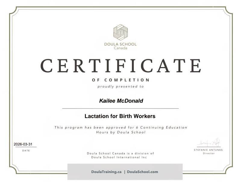 I am currently enrolled at Doula School Canada, completing my Birth Doula Certification. I expect to complete the certification in Spring 2026.